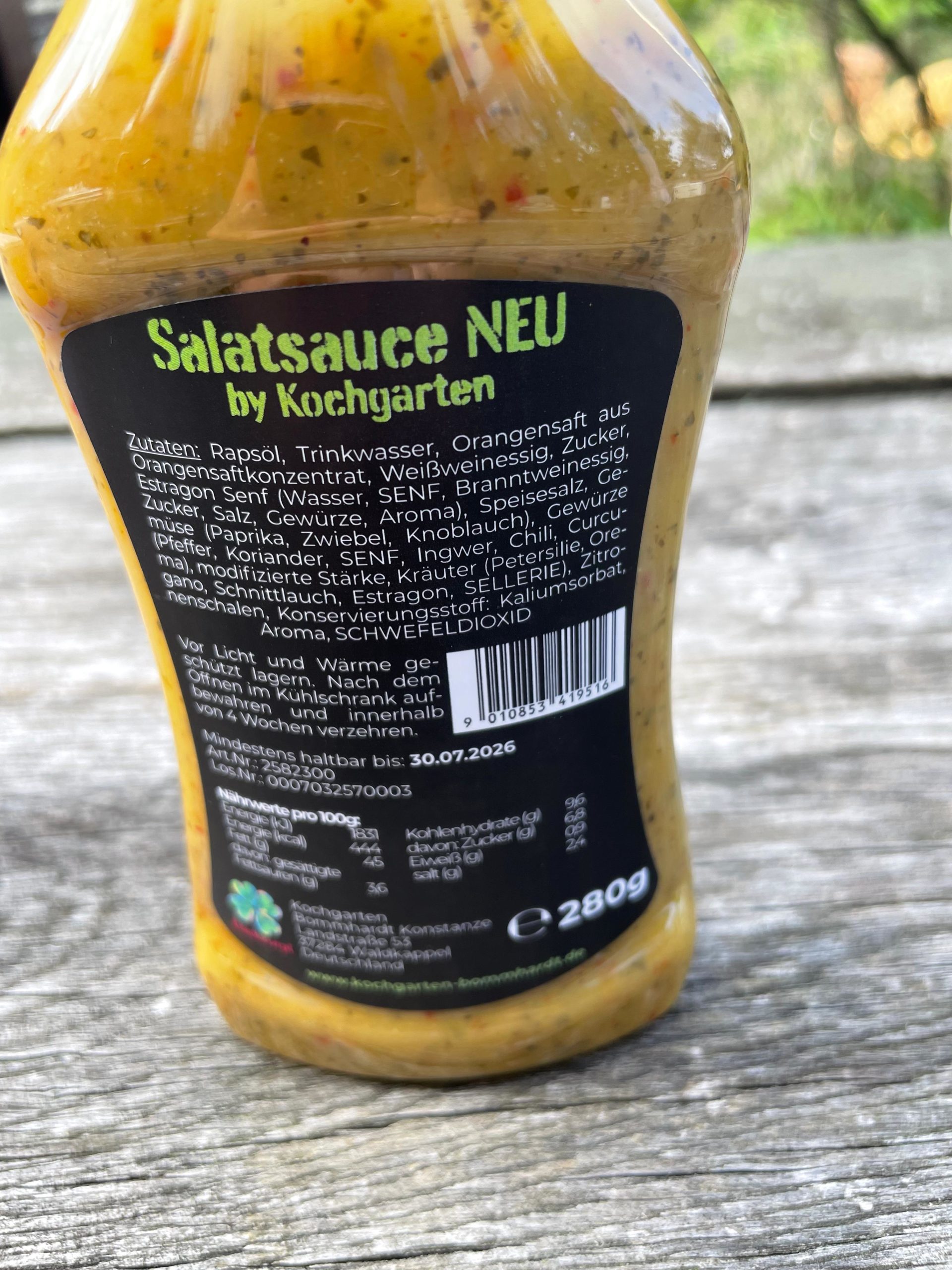 Rapsöl, Trinkwasser, Orangensaft aus Orangensaftkonzentrat, Weißweinessig, Zucker, Estragon Senf(Wasser, Senf, Brandweinessig), Zucker, Salz, Gewürze, Aroma, Speisesalz, Gemüse(Paprika, Zwiebeln, Knoblauch), Gewürze(Pfeffer, Koriander, Senf, Ingwer, Chili, Curcuma), modifizierte Stärke, Kräuter( Petersilie, Oregano, Schnittlauch, Estragon, Sellerie), Zitronenschalen, Konservierungsstoff: Kaliumsorbat, Aroma, Schwefeldioxid