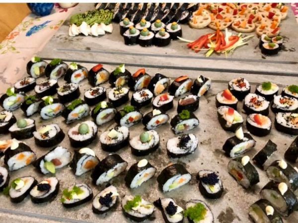Zubereiten und genießen von verschiedenen Sushi-Kreationen